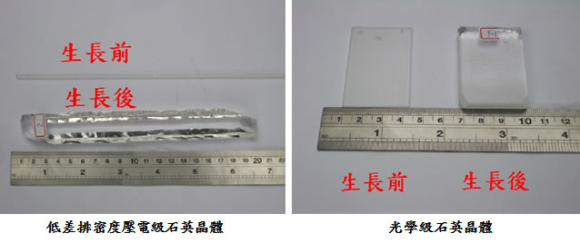 本產學合作研究主要是利用水熱法來生長低差排密度石英單晶晶體,水熱法生長單晶石英晶體,必須在高溫高壓的環境下進行,在單晶石英晶體生長過程中,影響生長速率及晶體品質的參數包括了生長溫度、生長壓力、礦化劑濃度、填充率、生長時間、隔板開口率等,本研究是以不同的隔板開口率為條件(隔板開口率約為2.5%至3.0%時),能獲得最快的生長速率。完成生長後的低差排密度壓電級與光學級石英晶體,從光學顯微鏡中觀察到晶界會明顯的減少,而晶粒也會變得較大,經過長時間的生長就會趨向長成單晶的結果。
