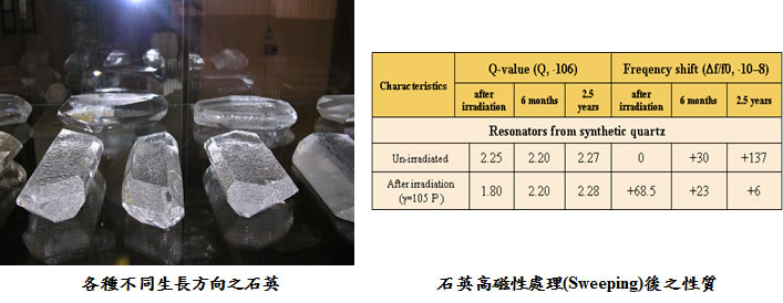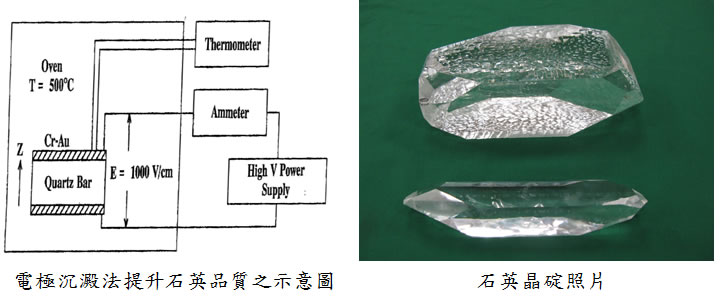 本研究主要是研發提升石英品質之技術,所使用之方法為電極沉澱法(Electrode deposition),利用一電極置於石英棒之Z表面,在電極上施以電壓,使沿著石英棒的Z方向產生電場,並緩慢加熱石英棒至高溫(約500℃)。當石英棒中的電流值逐漸衰減至一穩定值時,隨即緩慢冷卻石英棒至室溫後,移開電極。經由此程序可將石英內部所含之不純物及缺陷,以擴散方式移動到石英棒之兩端,然後將兩端切除,即可得到不純物及缺陷大幅淢少之高品質石英,並藉此大幅提升石英之性能。