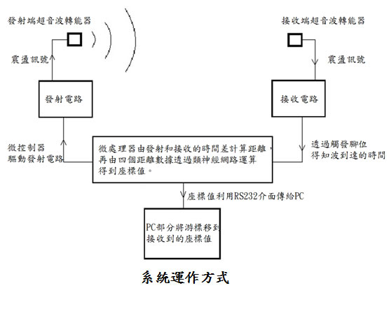 本研究的目的在研發聲納式觸控面板,本架構使用四顆超音波接收轉能器及一個超音波發射轉能器,四顆超音波接收轉能器分別置於觸控面板的四角,利用安裝在觸控筆上的超音波發射轉能器發射超音波,四角的超音波接收器接收訊號來得到觸碰點與四角的距離,再經由微控制器處理計算出觸碰點的座標,之後將座標數據回傳到電腦就可以使電腦的游標與觸控筆連動。