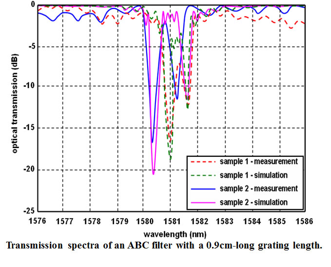 本研究結合全像術微影干涉技術及微模製作技術,研發出一個可以快速量產具高分子非對稱布拉格耦合器結構之雙閘道光補取多工器。其所獲得的交叉反射及自反射布拉格波長中,傳輸下降約為–16.4及–11.5dB 相對於-3dB 背景插入損失,以及3dB傳輸帶,寬大約為0.6及0.5nm,而且在二個單波導的有效折射率差值低於0.002才會有傳輸光譜部份重疊。