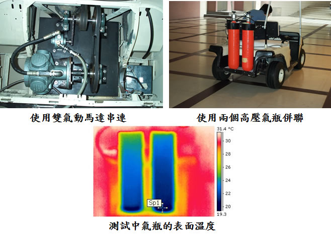 計畫在於研究兩人座之高壓空氣驅動氣動車之氣動系統,車體以電動高爾夫球車加以改裝,車體總重量為250公斤,使用14.7公升之複合材料高壓氣瓶,承受高壓空氣300 kg/cm2以上,在測試時考慮安全因素,使用之最高壓力為150 kg/cm2。測試時以使用單顆1.8 hp活塞式空氣馬達,或使用一顆0.93 hp葉片式空氣馬達串連此活塞馬達。高壓空氣經過調壓閥後以3~8 kg/cm2的壓力輸入氣動馬達。當僅以活塞式馬達驅動時,最高速度可以達10.9 km/hr,但以葉片馬達串連在活塞式馬達之後時,最高速度反而下降,僅有約4 km/hr,但其續行力則稍微增加。