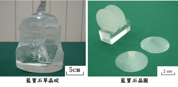 應用:藍寶石單晶可製作成飛彈光罩,並可裁製成晶圓,可做為藍白光發光二極體的基材,每年產值可達上千億元。