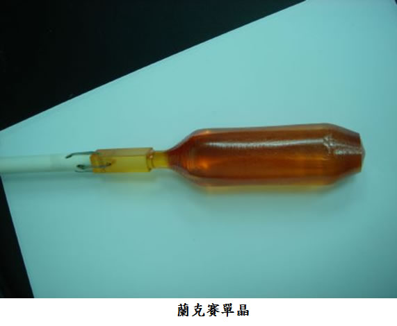 本研究主要是利用Czochralski 提拉法之長晶爐(Kristall-3M長晶系統),於2005年12月30日生長出台灣第一顆蘭克賽單晶(直徑35mm、長125mm、重量540g)。蘭克賽研究團隊致力於Czochralski長晶技術之研發,並研究長晶理論、晶體特性及晶體的應用,且以蘭克賽單晶製作了W-235共振器,獲得我國專利(編號:095217090),並獲2008年台北國際發明展銀牌一面。