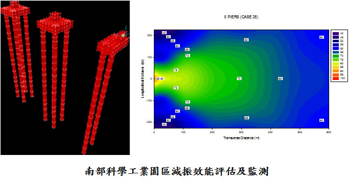 運用土木系研發之非線性有限元素分析程式SASSI及「雷射自動監測預警系統」進行減振效能評估及監測,減振案整體工程經費達80億台幣。承包廠商經土木系防災技術研究暨服務中心協助(計畫金額1600萬),進行施工監測與減振效能評估分析。分析及監測成果在距高鐵200m處減振9dB,有效達成減振成效。協助南科半導體與面板廠(產值達每年5000億),解決高鐵列車通過造成之振動影響。