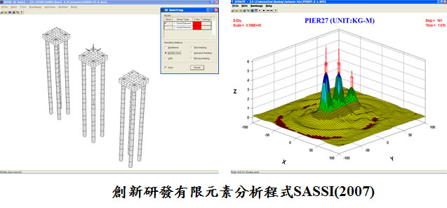 SASSI程式為國際間著名非線性FEM分析程式,原始程式每套10萬。土木系持續研發改進推出2007年改版程式,加入3D Sectional Pile Element, Simplified Pile Method, PFM-2Method, Structural Transmitting Boundary Element, Modified Matrix Element及等值線性法處理二維或三維分析之土壤非線性行為。改版後程式功能大幅提供,經南科減振專案驗證測試,證明程式功能創新,優於國際間相關類似程式,預估改版後價值每套將達NT$50萬以上。