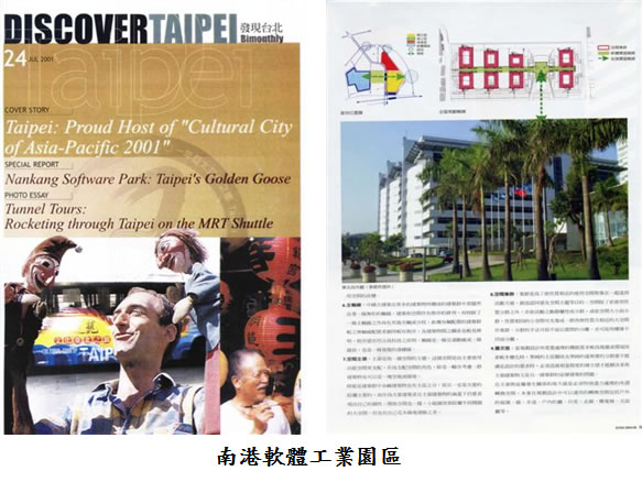 - 南港軟體工業園區:本規劃設計案由經濟部工業局推動,結合民間科技與電腦產業力量開發完成,是屬世界級的科技園區(依DISCOVER TAIPEI雜誌發表評論)。本園區第一期工程內容如下:地點:台北巿南港區;樓地板面積:187,247,12M2;建築面積:16,512.47M2;基地面積:39,608.3M2;建築高度:地下二層,地上A棟2層,B棟9層,C棟11層,D棟13層,E棟16層;公定造價:2,434,212,560元。
