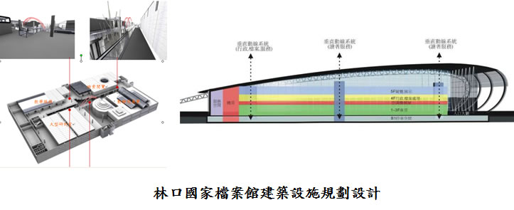 - 林口國家檔案館建築設施規劃設計:本研究擬定國家檔案館之建築企劃,並針對林口基地環境、建築空間及設施使用需求,設定相關設計準則,研究並探討檔案館相關應用服務空間之服務水準及設計內涵,並進行設計演練及3D空間模擬建築意像。